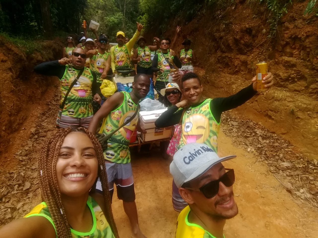 Durante a viagem os participantes se dividem em grupos.  No pelotão da frente segue o pessoal com a padiola. Um pouco atrás o pessoal que observa mais a viagem, e é também composto por pessoas mais idosas. O carro de mão segue dando suporte, levando água, suco, e também água que passarinho não bebe. Eu como tinha que observar quase tudo, me dividi entre os grupos para tomar nota.